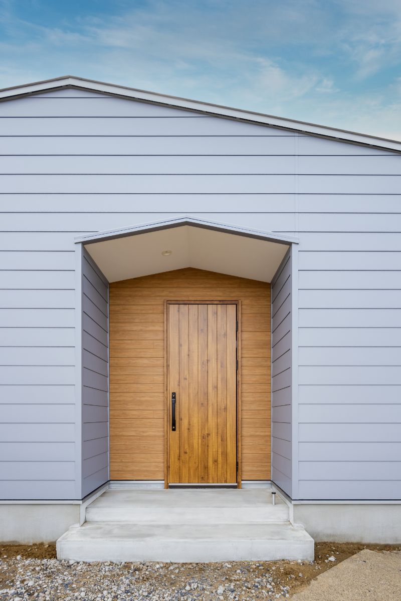アクセントとなる木目調の玄関ドアと組み合わせることで、ご夫婦の優しい雰囲気にぴったりな、柔らかく落ち着いた外観に仕上がっています。北西にある母屋への日照に配慮して切妻屋根にしたことで、デザインの可愛らしさも引き立ちました。