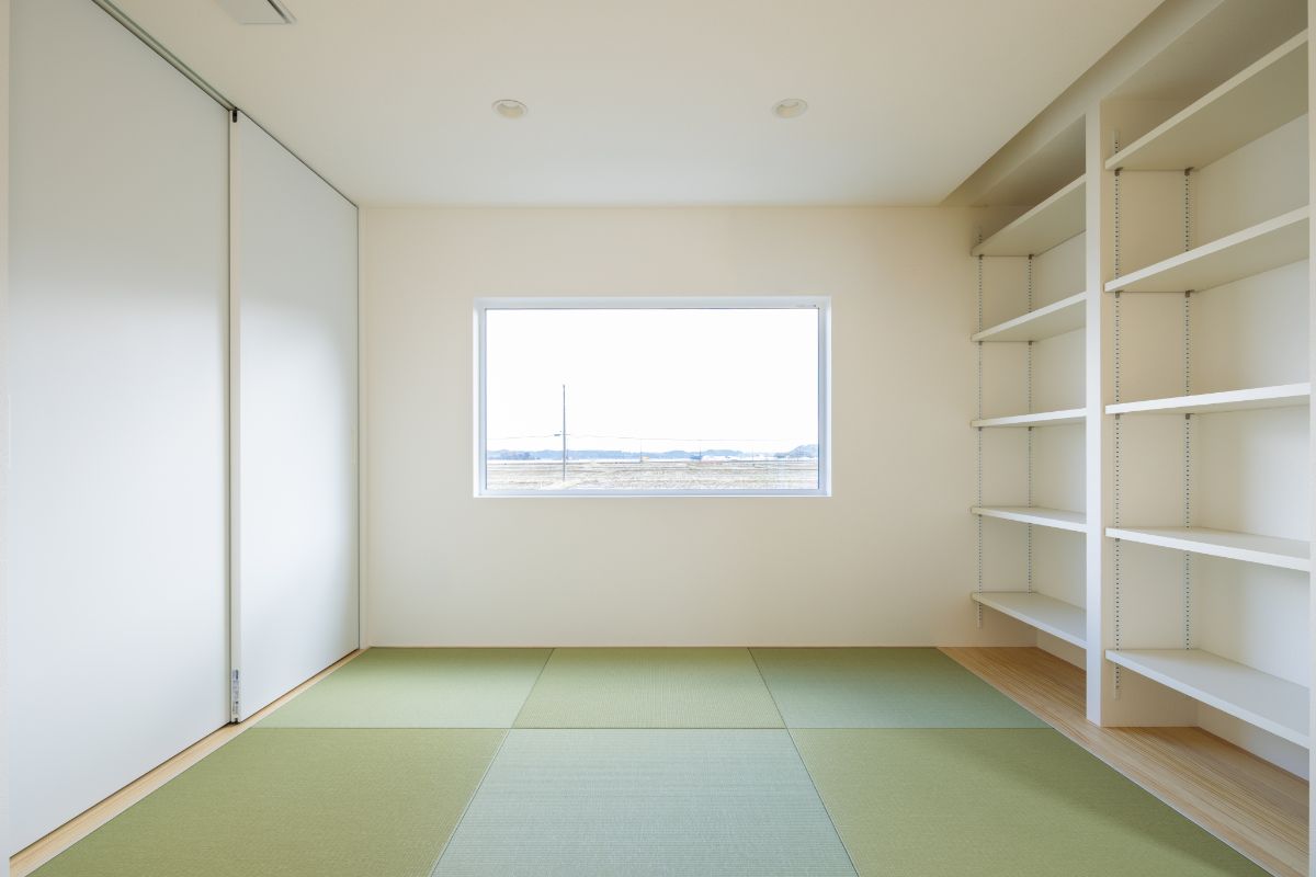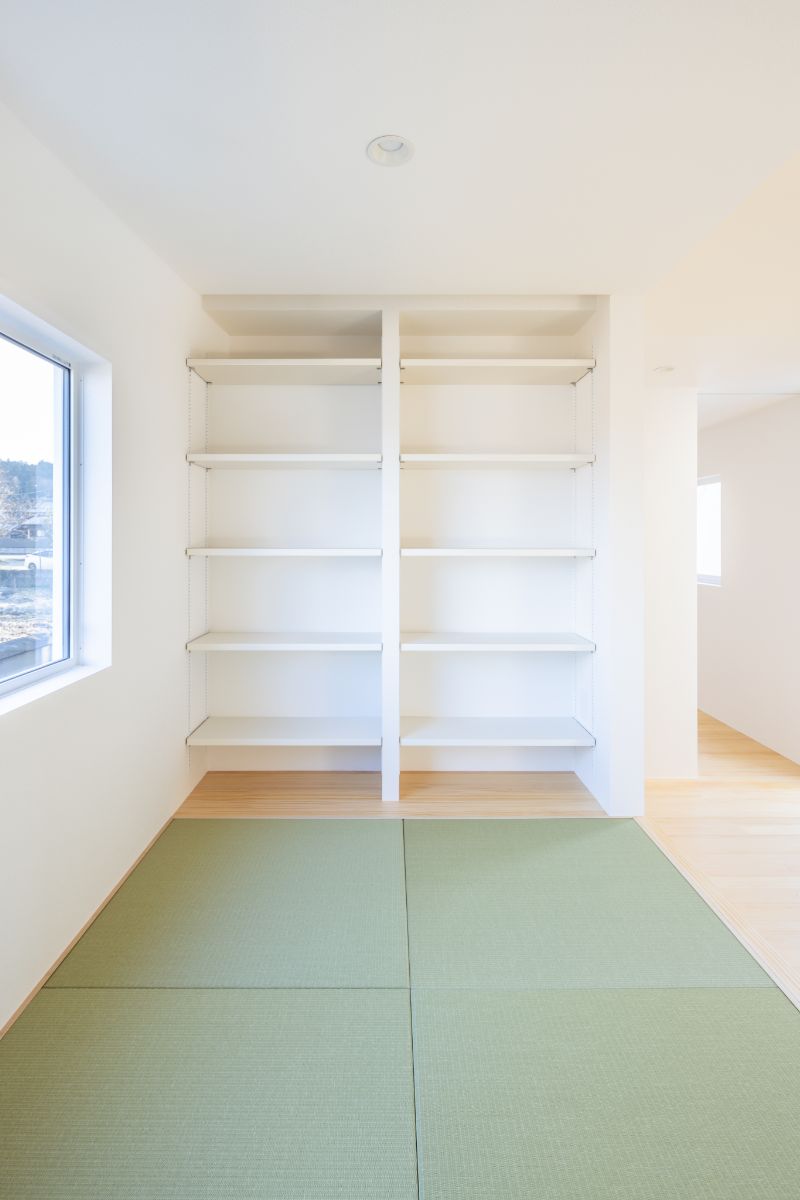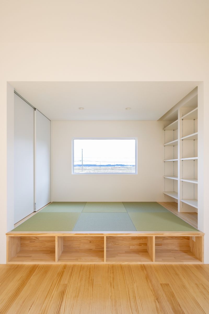 畳コーナーの下部は引き出しではなく、あえてオープンな収納にすることで、日用品やおもちゃをサッと片付けられるようにしています。