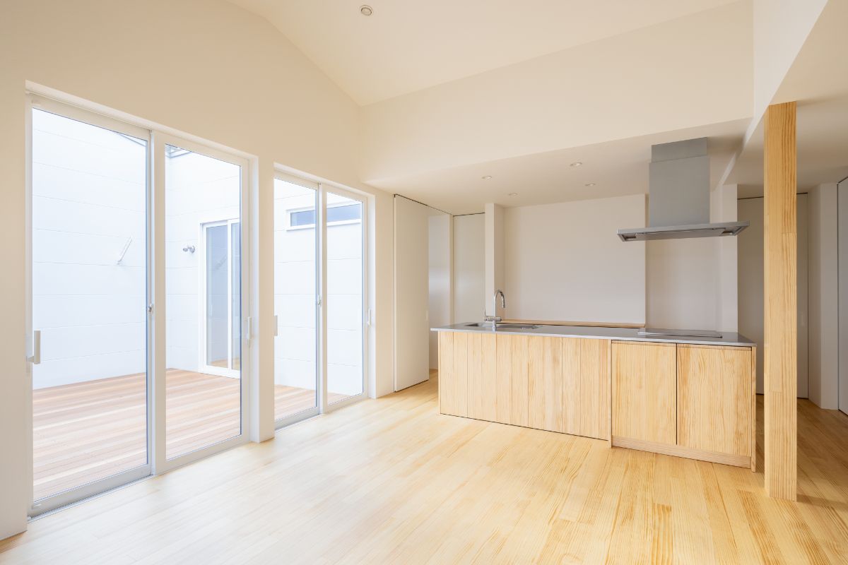 景色を切り取るキッチンと、開放的な勾配天井のLDK