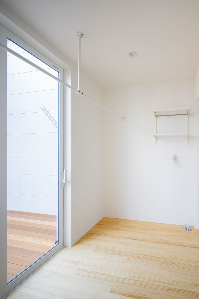このお家最大のポイントは、脱衣室から中庭のウッドデッキまで「わずか5歩」で移動できる究極の洗濯動線です。