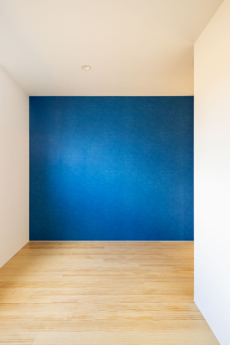 ご希望だったラピスラズリ色のアクセントクロスは、ただ似ている色を選ぶのではなく、色のRGB値までこだわって選定し、心から安らげる居場所をつくりました。