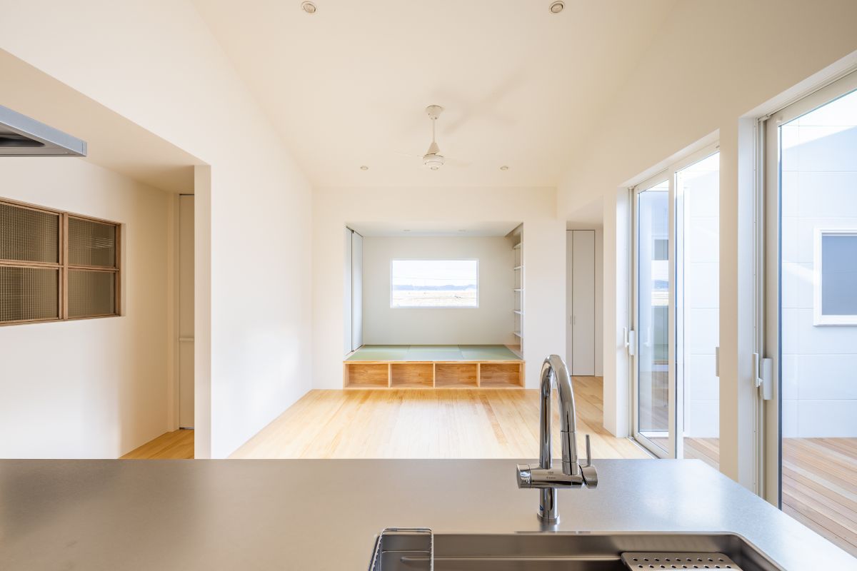 キッチンの正面、LDKの一角には、約3帖の小上がり畳コーナーを設けています。 高さを出すことでソファー代わりに腰掛けることができます。