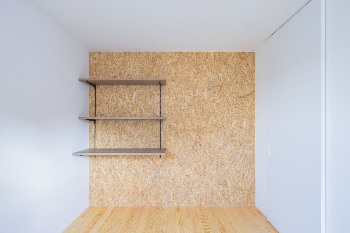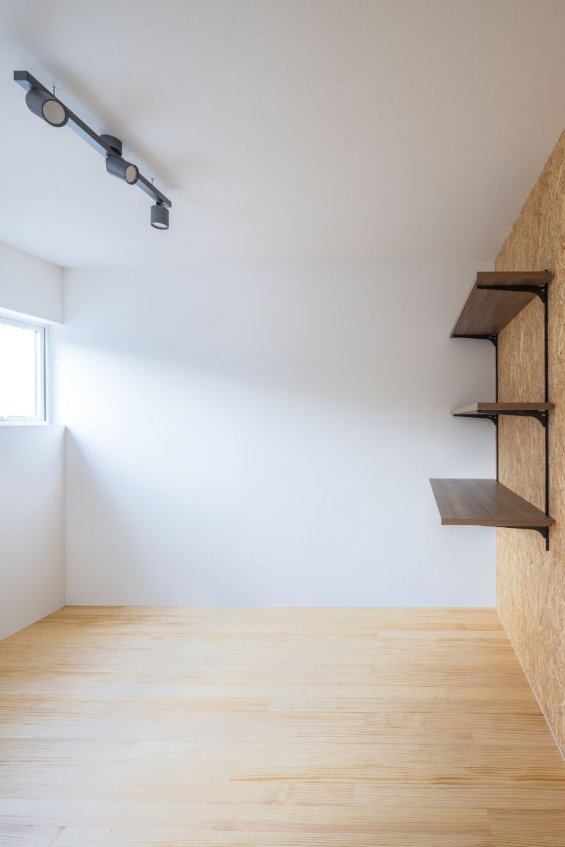 お部屋の壁にはOSB合板を採用し、自由に棚を取り付けたり趣味のものを飾ったりできる男らしい空間にしつつ、窓からは自然に母屋のご家族の様子が見守れるような配置にしています。